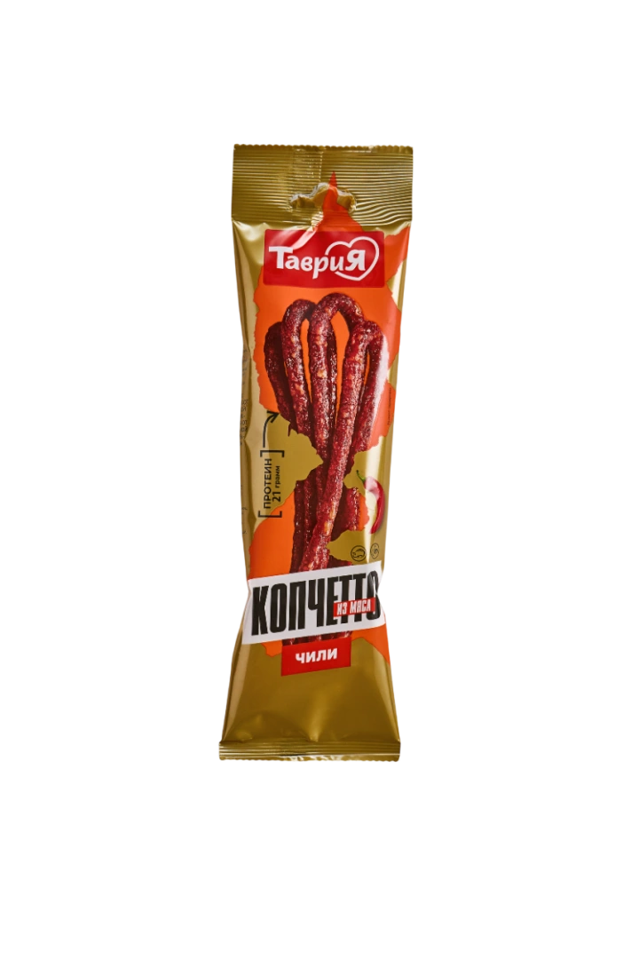 Тоненькие и длинные сыровяленые кнутики. Эти колбаски не надо чистить, их можно есть целиком. Натуральная оболочка из альгината — бурых водорослей — хрустящая и полезная для здоровья. «Копчетто» идеально подойдут для перекуса или закуски. Их можно взять с собой на природу, в дорогу, чтобы подкрепиться на работе, учебе и в компании друзей. Классические «Копчетто» с добавлением свиного шпика — нежесткие и сочные внутри. Пикантные «Чили» — умеренно острые¶¶ Состав:свинина, курица