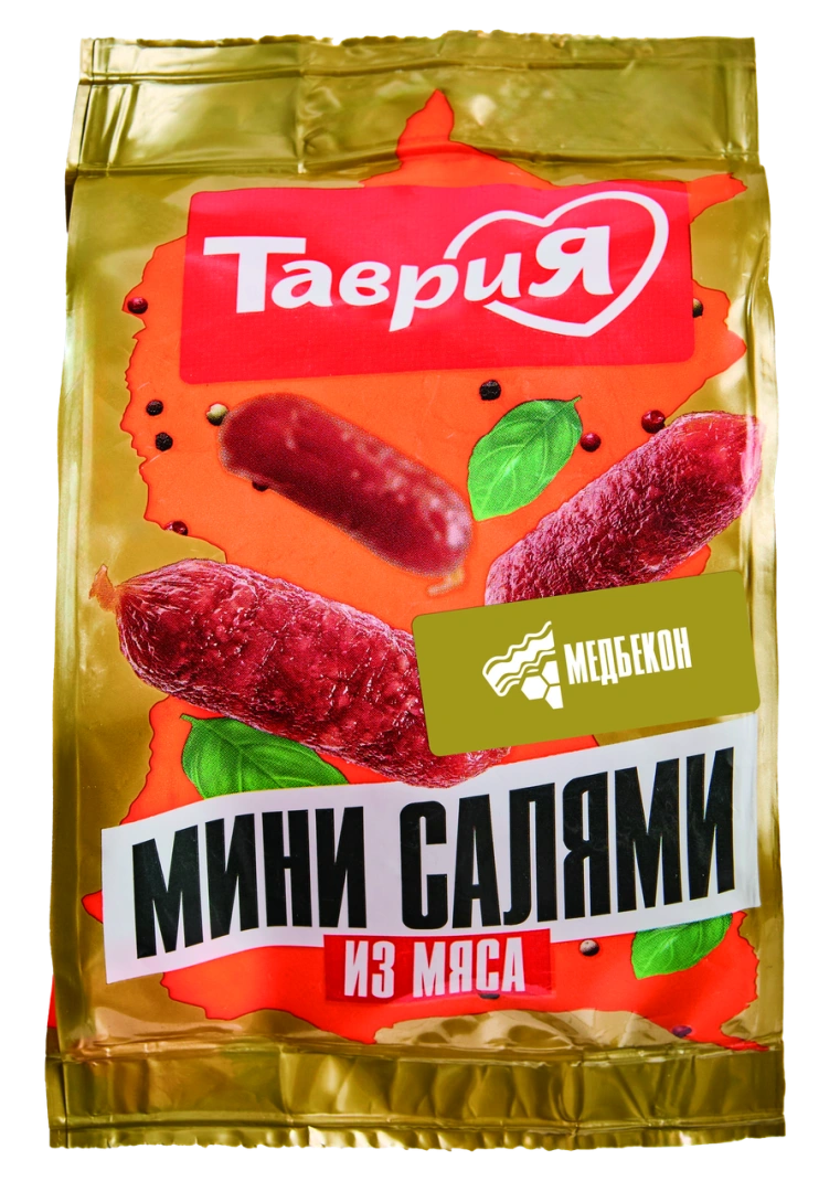 Это отличная закуска и замена вредному фастфуду. Ее тоже удобно брать с собой и делиться с близкими, такие мясные миниатюры питательные и сытные, быстро утоляют голод, при этом не содержат углеводов. Те, что с мёдом и беконом, имеют необычный многогранный вкус: сырокопченое мясо с чуть сладким оттенком и ароматом. Вообще «Таврия» производит мини-салями в пяти разных вкусах: классическом мясном, с ароматом вяленых томатов — для поклонников итальянской кухни, с брусникой и с нотками южного ореха. Состав:свинина, говядина, курица