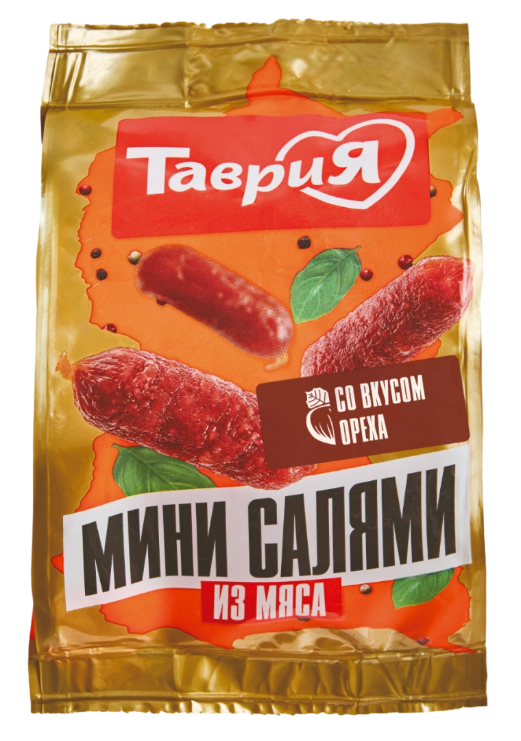 Это отличная закуска и замена вредному фастфуду. Ее тоже удобно брать с собой и делиться с близкими, такие мясные миниатюры питательные и сытные, быстро утоляют голод, при этом не содержат углеводов. Те, что с мёдом и беконом, имеют необычный многогранный вкус: сырокопченое мясо с чуть сладким оттенком и ароматом. Вообще «Таврия» производит мини-салями в пяти разных вкусах: классическом мясном, с ароматом вяленых томатов — для поклонников итальянской кухни, с брусникой и с нотками южного ореха. Состав:свинина, говядина, курица