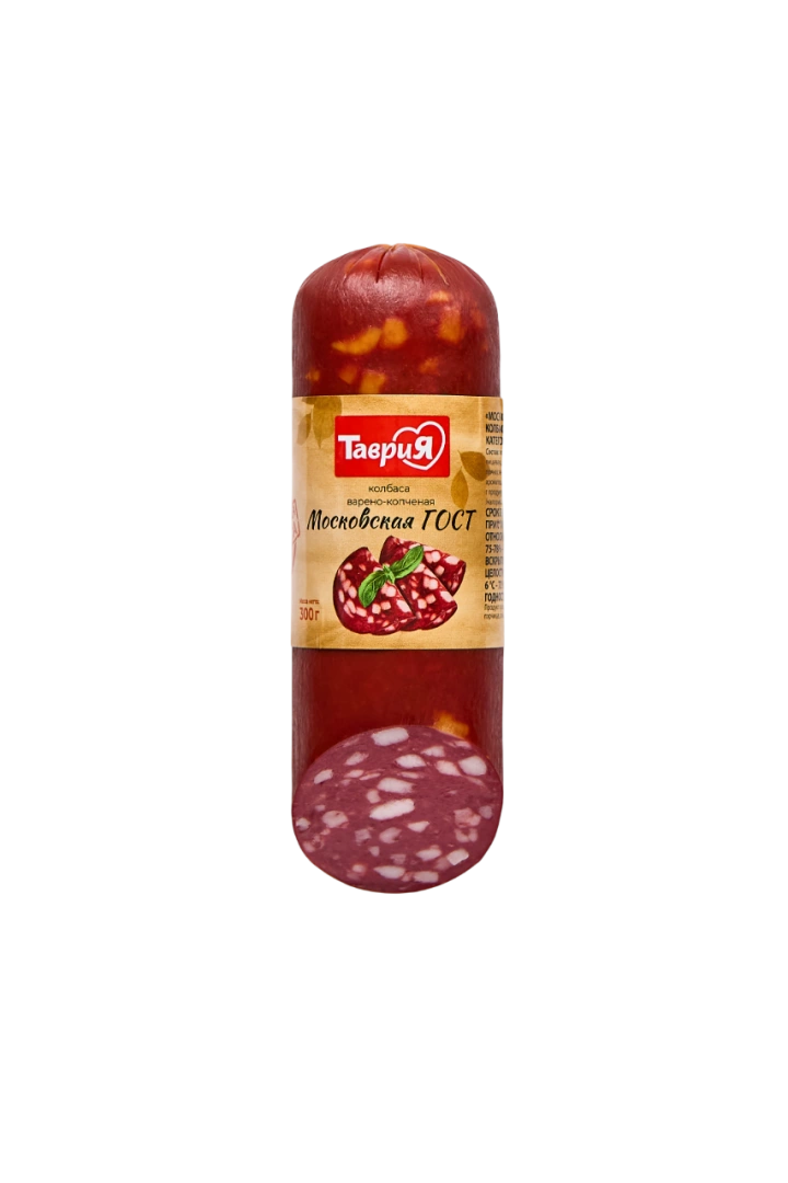 Королева сервелатов, "Московская ГОСТ" - настоящая варено-копченая колбаса, изготавливается в строгом соответствии с ГОСТом. Сырьем для неё стали лучшая говядина и отборный свиной шпик. Обладает неповторимым красивым рисунком и ароматом, который придает черный перец и мускатный орех. Состав:говядина