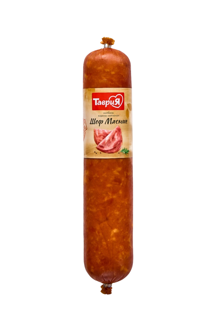 Варено-копченую колбасу «Шеф мясник» по-настоящему можно назвать шедевром! Просто десять из десяти! Не раз отмечена наградами и высшим баллом на выставках.Крупнокусковую свинину в составе, сдобренную душистым перцем полюбит даже взыскательный покупатель. Натуральный состав оценят гурманы и любители настоящих мясных блюд. Пропитанная благородными нотками копчения уместна на праздничном столе, а так же будет отлично смотреться на повседневных бутербродах. Состав:свинина